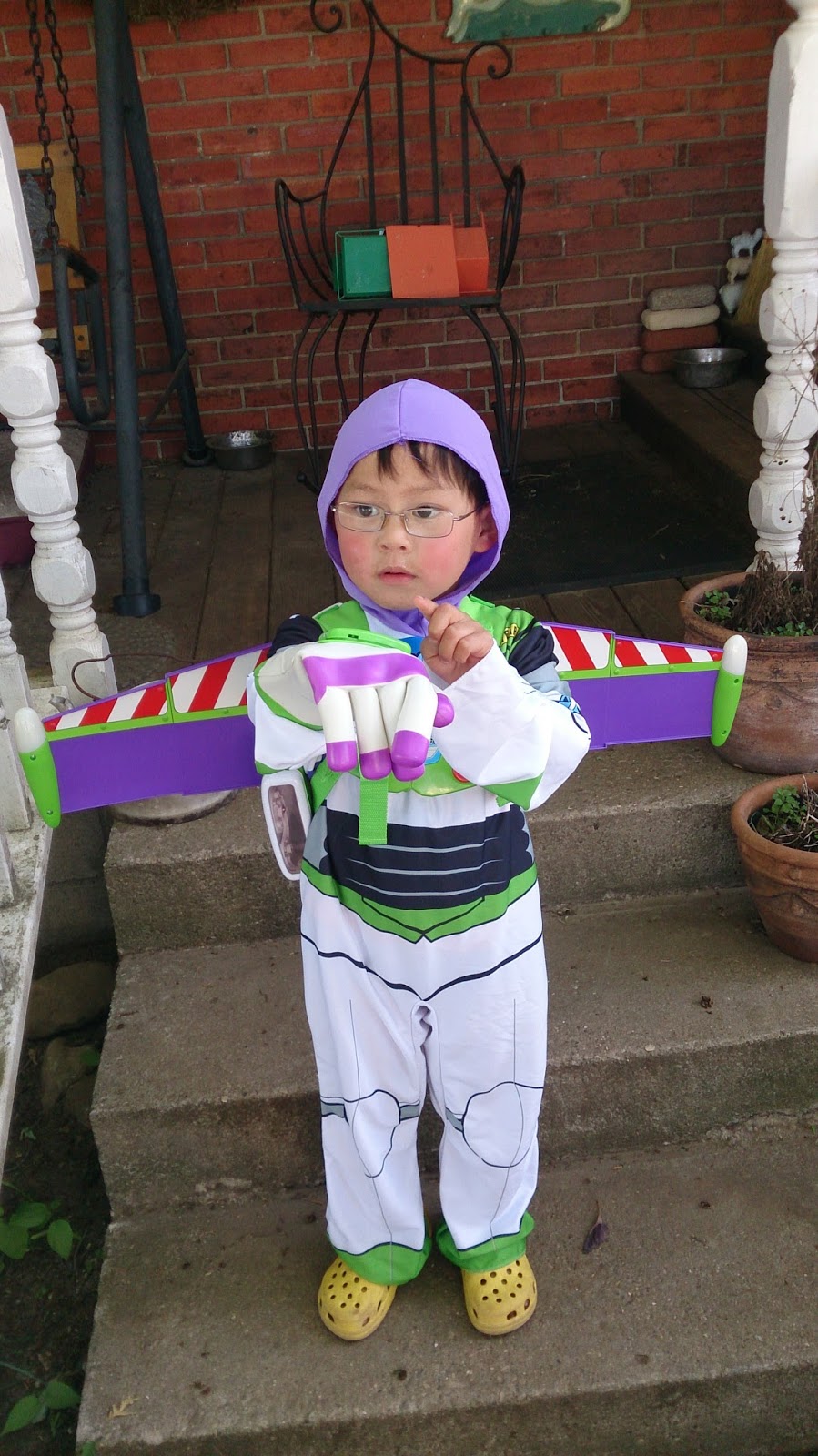 For his birthday he got a complete Buzz Lightyear outfit. He is busy fighting off the evil Zurg with his lazer glove.